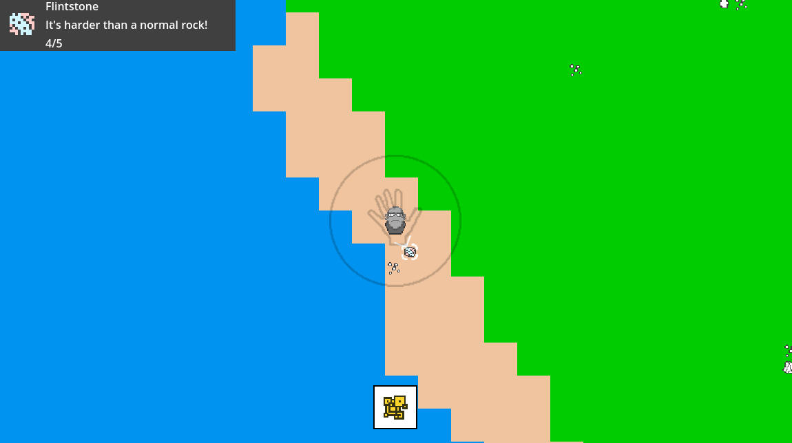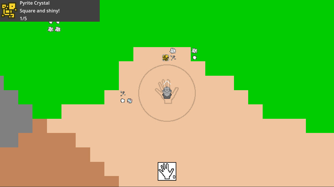 Prog is a caveman who would ascend humanity's tech tree of his own accord. This was initially started as a means to figure out procedural world generation, but I also discovered a great way to set up an item system along the way.Running through each tile at generation time can be a taxing affair, but if you juggle chunk size with view distance, you can land on optimized values for your situation. Running several noisemaps and other pre-baked heightmaps to read for each tile, to determine what tile to place. If it's hot and dry, make it a desert tile. If it's above mountain start elevation, make it a mountain. If the area is volcanic, generate lava at the highest points of the regional mountains. Tie certain minerals to elevation or volcanism, so you have to dig further into the mountains/volcanoes to find them. Does the tile have nearby saltwater? Run the algorithm for determining whether it's a sandy or rocky beach and flag it to periodically spawn stuff like driftwood, flintstones, and seaweed.The item system was fun to bring to life. You start, in Godot at least, by creating a new type of resource containing your base-level item info, such as its name, description, icon, flammability, etc. Then you make a sub-type of that item info resource, say minerals for example. You could then define a melting and boiling point, any other items it's composed of, and volatile reactions, etc. If you then go to make another item subtype for tool/weapon parts, you can then define head shapes, like for a hammer, axe, or spear, make a mold item to cast a mineral to, then put that loaded mold into a furnace sufficient to process it.In short, this was a very productive prototype. I learned not just procedural generation, but also a nice, easily-filterable items system, as well as continued to get familiar with the Godot engine.